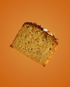 Soft texture, made with fresh orange juice and topped with sliced almonds.