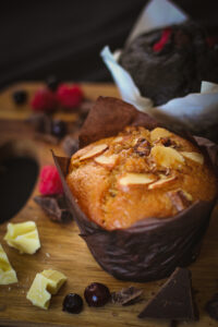 Chocolate muffin with dark chocolate icing and white chocolate chips topping.