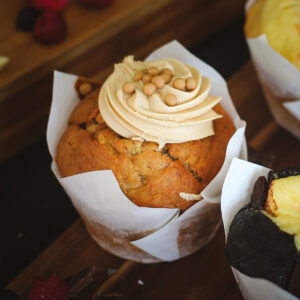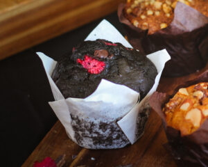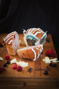 Muffin made with raspberry and white chocolate bits, topped with white chocolate icing.