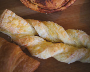 Garlic and cheese sausage filling in a flaky pie pastry.