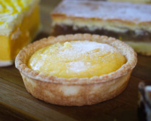 Crispy pastry cases filled with a creamy lemon custard, topped with coconut shavings.