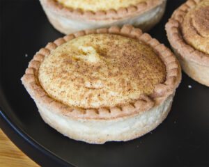 Crispy pastry case filled with a creamy vanilla custard and dusted with nutmeg.