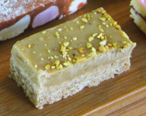 Classic ginger shortcake topped with a generous layer of spiced ginger icing then sprinkled with pistachio nuts.