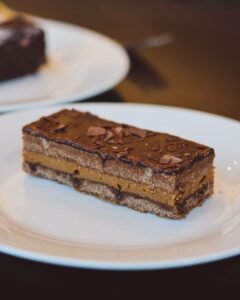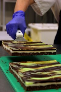 Chocolate and coconut base, with a feathered peppermint and chocolate icing on top.