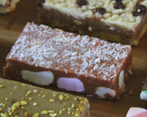 Moreish chocolate shortcake and rich caramel layered slice, topped with silky icing and chocolate flakes.