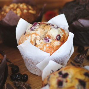 Blueberry, blackberry and raspberry muffin, with injected filling and crumble topping.