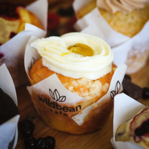 Passionfruit and lemon on a coconut shortcake base, finished with white chocolate.