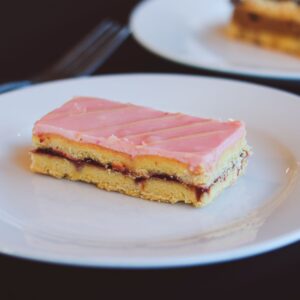 Buttery shortcake, layered with raspberry and topped with sweet pink raspberry icing.