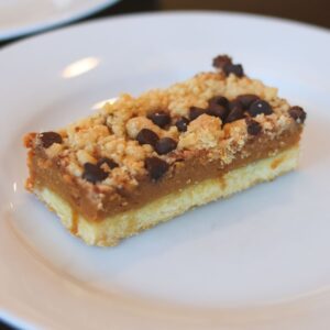 Decadent sweet caramel filling on a chocolate biscuit base, with a chocolate crumble topping.